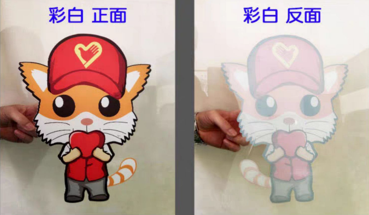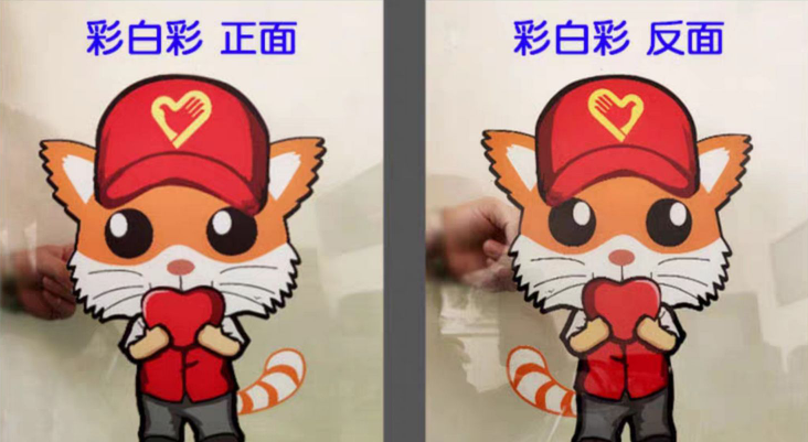 彩白是先打一層彩色再打一層白(bái)色,正麵看過去是彩色的, 反麵看是一層白色,貼在(zài)玻璃上,顏色不透明,飽和度高(gāo)一些,不會因為材料是透明的使得顏色也是透明的,多為單麵看。