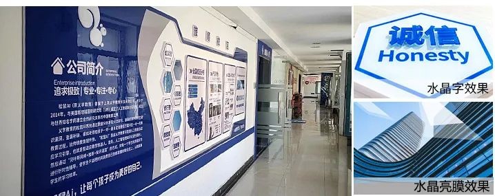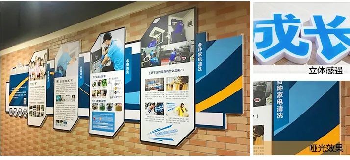 工藝:PVC覆鋼化貼、膚感貼再加異形包覆(fù)側噴(pēn)、側麵噴漆、熱熔封邊、鋼化無(wú)框折彎的工藝,配合磁性畫麵、焗漆水晶字等最新工藝,將每個文化牆(qiáng)做成手工藝品。