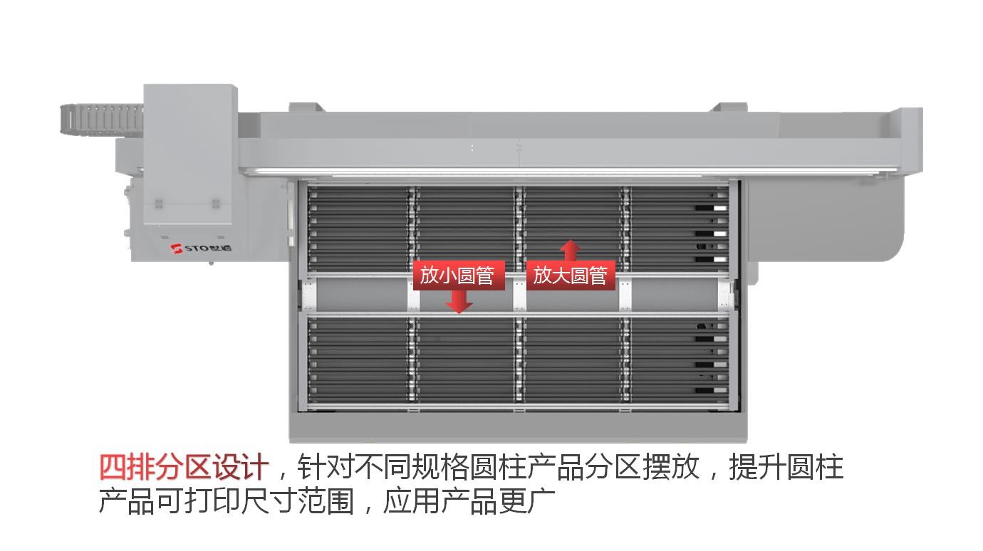 四排分區設計,針對不同規格圓柱產(chǎn)品(pǐn)分區擺放,提升圓(yuán)柱產品可打印尺寸範圍(wéi),應用產品更廣(guǎng)。